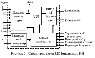 Крім електронних ВкП широко використовуються спеціалізовані МС для імпульсного і частотного способу набору номера. Електронний імпульсний НН виконує дві основні функції: замикання лінії, а також відключення приймача телефону під час набору номера. Будова найпростішої МС імпульсного НН показана на рис.6.