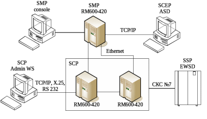 SMP пов'язаний з SCP через внутрішньосистемний інтерфейс за допомогою локальної мережі LAN з використанням протоколу Ethernet (рис. 1). Інтерфейси із зовнішнім оточенням (оператор мережі, постачальники та абоненти послуг) базуються на протоколах Х.25, TCP/IP, RS232-V.24. У проекті реалізована конфігурація «ведучий-ведений» із двох серверів типу RM600-420 сімейства RM, виробництва фірми Siemens Nixdorf.