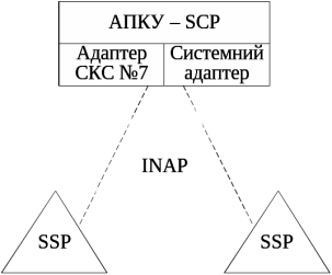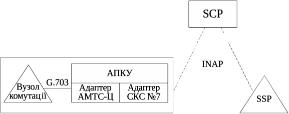 Інший спосіб використання АПКУ пов'язаний із можливістю його застосування при побудові цільової архітектури IN. У цьому випадку АПКУ зможе виконувати роль інтерфейсних погоджуючих пристроїв між вузлами комутації та інтелектуальною надбудовою. При цьому системи комутації, дооснащені обладнанням АПКУ, перетворюються на вузли SSP (рис. 8). Сполучення АПКУ з такими вузлами комутації здійснюватиметься за стандартним цифровим стиком G.703, а взаємодія з іншими вузлами інтелектуальної надбудови – по мережі або виділених каналах СКС №7 відповідно до прикладного протоколу INAP.