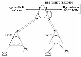 В будь-якому випадку, при наданні послуг IN виникатимуть додаткові затримки виклику у ТМЗК, оскільки не всі абоненти IN підключаються безпосередньо до вузла, що виконує функції комутації послуг. Припустимо, що розглянута телефонна мережа містить лише одну станцію з функціональними можливостями SSР. Інформація про виклик послуги надходить від усіх станцій на SSР за заздалегідь установленими маршрутами. На рис. 4 показано фрагмент такої мережі у вигляді дерева, у вузлах якого розташовані АТС, а вітки відповідають основним маршрутам проходження сигнальних повідомлень від АТС до SSР. Тут не показані обхідні маршрути передачі сигнальних повідомлень.