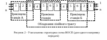 Тому побудова ВОСП аналогічна побудові будь-якої проводової багатоканальної системи передачі, в складі якої є прикінцева та проміжні станції, з'єднані безперервною направляючою системою . На рис. 2 наведена узагальнена структурна схема ВОСП (для одного напрямку передачі).