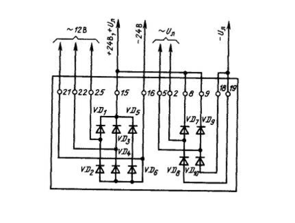 Второй выпрямитель для лампочек сигнализации собран по однофазной двухконтактной (мостовой) схеме.