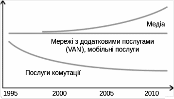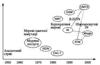 До середини 80-х років основним завданням під час проектування систем зв'язку було забезпечення високої пропускної спроможності за прийнятною ціною. Оскільки ця мета була частково досягнута з розгортанням волоконно-оптичних систем і впровадженням технологій SDH, B-ISDN, ATM, на телекомунікаційному ринку набуває значущості інший фактор – можливість швидкого розвитку комплексних телекомунікаційних послуг, що задовольняють зростаючі потреби абонентів. Загалом в історичному розвитку телекомунікаційних мереж і послуг можна умовно виділити такі основні етапи (рис. 1):