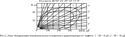 В качестве реального примера на рис. 5 показаны две такие зоны обнаружения по запросу, построенные для случаев, когда превышение принимаемых ответчиком сигналов над мощностью, соответствующей чувствительности приемника ответчика, составляет 8 дБ (кривая 1) и 10 дБ (кривая 2).