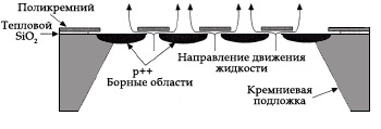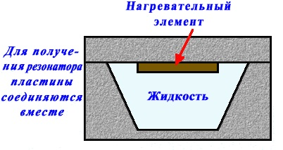 Тепловые актюаторы могут создавать относительно большие силы, но нет конструкции которая бы позволяла это сделать с позиции эффективного использования энергии. Результат улучшается при увеличении разницы между коэффициентами теплового расширения и при большом изменении температуры, однако достигаемое КПД всё равно остаётся относительно маленьким. Газы и жидкости имеют намного больший коэффициент теплового расширения, чем твёрдые тела, и это можно использовать в термопневматических микроактюаторах. На рис. 11 показан резонатор, внутри которого находится жидкость, с тонкой мембраной в роли нижней стенки. Через нагревательный элемент (резистор) пропускается ток. Жидкость нагревается и начинает расширяться, деформируя мембрану.