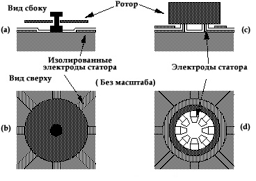 Двигатели качения названы так по действию раскачивания, положенному в основу их принципа работы. На рис. 3 (a, b) показана конструкция двигателя качения, полученного при помощи технологии поверхностной микрообработки. Ротор - это круглый диск. Во время работы снизу расположенные электроды последовательно, друг за другом, включают и выключают. Диск последовательно притягивается к каждому электроду; край диска контактирует с диэлектриком, расположенным над электродами. В такой манере он медленно вращается по кругу; делая один оборот вокруг своей оси совокупностью нескольких изменений напряжения на статоре.