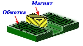 Примером магнитного микроактюатора другой конструкции может служить линейный мотор, показанный на рис 6. Магнит, расположенный в канале, движется взад-вперёд при переключении тока в обмотках, то с одной, то с другой стороны канала.