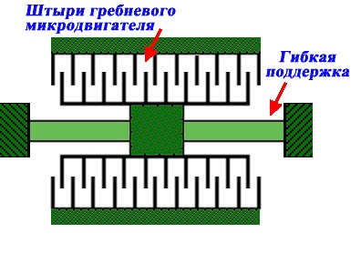 Гребневые микродвигатели состоят из большого количества встречностержневых штырей (рис. 2). При приложении напряжения, появляется сила взаимодействия между штырями, и они начинают двигаться. Увеличение ёмкости пропорционально количеству штырей, таким образом, для генерации больших сил, требуется большое количество штырей. Одной из потенциальных проблем такого устройства будет то, что если поперечное расстояние между штырями не одинаково с обеих сторон, (или если устройство поломано), то возможно движение штырей под прямым углом к правильному направлению и соединение их друг с другом. Гребневые двигатели особенно распространены среди устройств, полученных поверхностной микрообработкой.