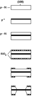 | 3. Химическое воздействие: с обратной стороны (мембраны, отверстия) -геометрическая форма определяется шаблоном маски, с передней стороны (консоли, каналы, затворы) - геометрическая форма определяется подтравливанием. | 3.Возможно получение рельефных изображений | 3.Нет собственного ограничителя травления и определения изображения |