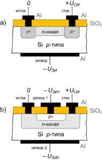 В МДП-транзисторах с индуцированным каналом (рис. 2, а) проводящий канал между сильнолегированными областями истока и стока отсутствует и, следовательно, заметный ток стока появляется только при определённой полярности и при определённом значении напряжения на затворе относительно истока, которое называют пороговым напряжением (UЗИпор).