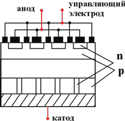 Наибольшему изменению подверглось устройство катодного слоя n. Он разбит на несколько сотен элементарных ячеек, равномерно распределённых по площади и соединённых параллельно. Такое исполнение вызвано стремлением обеспечить равномерное снижение тока по всей площади полупроводниковой структуры при выключении прибора.
