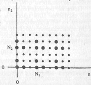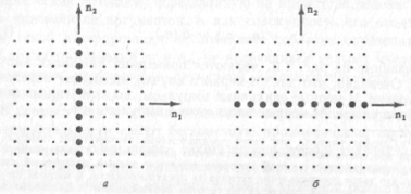 Нарешті, двовимірний дискретний сигнал (або масив, послідовність) – це функція, визначена на безлічі упорядкованих пар цілих чисел. Окремі елементи цього масиву називаються відліками. Значення відліків можуть бути речовинними або комплексними. Відповідно до визначення, двовимірні послідовності мають нескінченну довжину. Однак на практиці для більшості двовимірних послідовностей значення відліків відомі тільки в кінцевій області площини. Тому звичайно вважають, що всі значення відліків за межами визначеної області дорівнюють нулю. Приклади двовимірних дискретних послідовностей різних типів показані на рис. 3 – 6.