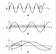 Измерения фазы и частоты обычно производятся цифровыми методами. При измерении частоты в режиме частотомера подсчитывается число периодов или полупериодов исследуемого сигнала за заданный интервал времени Т (рис.4, а). При измерении частоты в режиме периодомера подсчитывается число заполняющих импульсов существенно большей частоты за заданное число периодов исследуемого сигнала (рис.4, б). При измерении фазы подсчитывается число импульсов между переходами через нуль с одинаковой производной опорного и преобразованного сигналов и измеряется период, если он заранее не известен (рис.4, в).