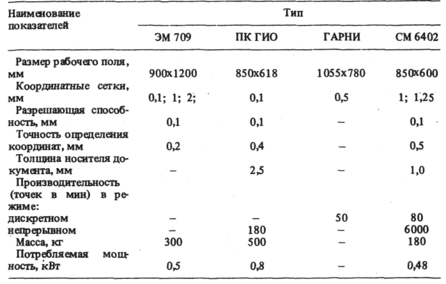 Подобные устройства имеют два режима работы: дискретный - когда оператор после установки зонда в требуемой точке дает команду на определение координат зонда, и непрерывный, когда оператор перемещает зонд вдоль некоторой линии, а устройство ввода автоматически вычисляет и фиксирует координаты некоторой последовательности точек. Для идентификации объектов в состав устройств кодирования включаются различные клавиатуры и функциональные кнопки. В табл. 1 представлены характеристики наиболее распространенных устройств кодирования информации.