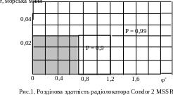 Аналогічні залежності для радіолокатора Condor 2 MSSR наведені на рис.1. Дані отримані для випадку розташування у просторовому вікні двох цілей, ймовірність відповіді яких на запит дорівнює 0,9, швидкість обертання антени запитувача дорівнює 15 об/хв, частота запитів – 150 Гц, а ймовірність правильного декодування інформації відповіді у нормі.