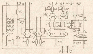 В ИМС предусмотрен также каскад на транзисторе VT13 внутренней АРУ дя предотвращения перегрузки при сильных сигнала и стабилизатор напряжения на транзисторе VT1 и диодах VD1. VD5.