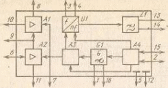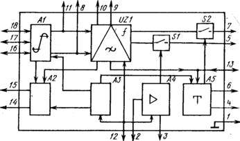 Усилитель-ограничитель А1,Детектор уровня А2,Частотный детектор UZ1,Стабилизатор напряжения A3,Усилитель А4,Триггер А5,КлючиSI,S2.