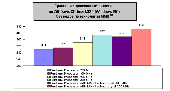 Производительность процессора Pentium при выполнении действий с целыми 32-разрядными числами в среде Windows иллюстрируется с помощью обычно используемых эталонных тестов Windows. Эти эталонные тесты демонстрируют высокие потенциальные возможности процессора Pentium корпорации Intel, когда на нем выполняются 32-разрядные приложения.