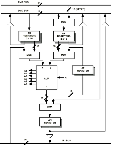 Порт ввода X может принимать данные из двух источников: из регистра АX и с шины результатов R. R-шина соединяет выходные регистры всех вычислительных модулей. Регистр AX предназначен только для порта X и состоит из двух частей AX0 и AX1. Эти регистры подключенны к DMD-шине. Система команд позволяет чтение регистра AX и с помощью PMD-шины, но прямого соединения с ней нет, эта операция использует модуль DMD-PMD обмена. Выводы регистров AX0 и AX1 реализованы таким образом, чтобы один обеспечивал ввод в ALU, а другой в это время управлял DMD-шиной.