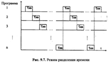Условием прерывания текущей программы является либо истечение выделенного кванта времени, либо естественное завершение (окончание) решения, либо прерывание по вводу-выводу, как при классическом мультипрограммировании. Для реализации режима разделения времени необходимо, чтобы ЭВМ имела в своем составе развитую систему измерения времени: