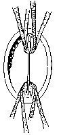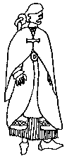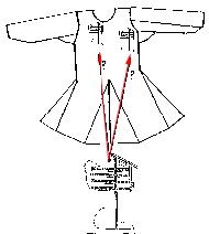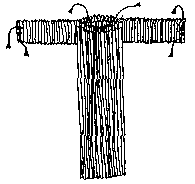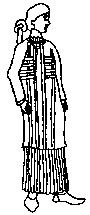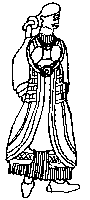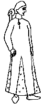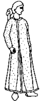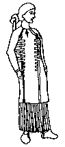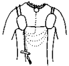 Передник оборачивался вокруг тела, причем передняя часть оставалась открытой. К верхним углам пришивались петли, к которым крепились черепаховидные фибулы. Две дополнительных петли пришивались сзади к середине верхнего края и, будучи перекинутыми через плечи, скреплялись с передними петлями фибулами.