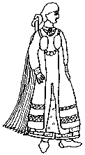 Третий вариант добавлял к предыдущему (передник и нагрудник) длинный шлейф сзади, который также крепился петлями к черепаховидным фибулам. Иллюстрацию такого варианта можно обнаружить на серебряной фигурке валькирии.