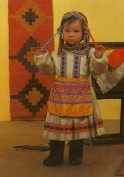 | Своеобразной формой отличались женские головные уборы хушпу. Они бывают двух видов конусообразные и шлемовидные, имеют "хвост"- деталь спускающаяся на спину.Двух видов бывают и девичьи головные уборы тухья - островерхие и без острия, наспинной части у них нет. Художественные приемы, использованные в шитье, богаты и разнообразны. Мастерицы с большим умением и вкусом размещали каждую монету и бисеренку. Среди изделий из серебра и бисера в одном ряду с тухья и хушпу находятся женские и девичьи нагрудные украшения шулкеме. В отдельных этнографических подгруппах их называли также подвеской к супрану или ама. Девичье украшение в отличие от женского не имело треугольной детали, служащей для крепления сурпана и был одноярусным. У верховых чуваш шулкеме состоял в основном из двух одинаковых частей и имел квадратную форму, а у низовых и промежуточных - полуовальную и прямоугольную. Среди шитых серебром и бисером предметов особое место занимает женское и девичье украшение - тевет. Надевали его через левое плечо. Женщины носили тевет в основном на свадьбах, а девушки - во время весеннего обряда "девичья пашня", в хороводах и на осенних праздниках, посвященных овину, первому хлебу и льну. Одним из традиционных праздников был "девичье пиво" - в честь хмеля и нового пива, когда все девушки участницы обязательно должны надевать тевет. Костюмы чувашей и их орнаментация различались по трем этнографическим группам. Узоры низовых вышивались на домотканом белом холсте всегда крупные, полихромные. Основной орнамент часто исполнялся нашивкой широкими полосами маренового цвета и сопровождался мелким узором. Для орнаментации характерны черты монументальности. Мастерицы-вирьялки, кроме белого холста, применяли также цветную основу, любили мелкий, филигранно выполненный орнамент. Костюм их отличался формой ношения. Непременной принадлежностью их туалета были черные онучи. Костюм и узоры средненизовых более близки к низовым. Женские рубашки отличались богатой орнаментацией нагрудной части. Ее украшали узоры , розетки. Розетки состояли из наложенных друг на друга спицеобразных фигур. Узоры имели форму ромба. Среди них большой интерес представлял сложный орнамент , имеющий ассиметричную композицию, которая встречается только в вышивке рубашек замужней женщины. Орнаментация женского костюма подчинялась общей композиции. Подол, по сравнению с другими частями рубашки, вышивался более скромно, в его украшении соблюдался четкий ритм. Большую роль играло ритмичное чередование широких и узких полос, включающих в себя нашивки и геометрические узоры. Свой природный дар и умение чувашские мастерицы раскрывали в украшении набедренников. Носили их как в праздничные дни, так и в будни. Для исполнения узоров применяли шелковые и шерстяные нити. Вышивка была односторонняя, широко использовалась нашивка. Длинная бахрома, коричневого или синего цвета, обогащала набедренник при движении, играя на белом фоне рубашки, оживляя весь костюм женщины. | |||
