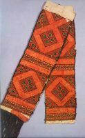 | Узоры старинного мужского халата, размещаемые вокруг грудного разреза, на плечах, на груди, на спине, на рукавах, на подолше, подчинялись, как и на женской рубашке, единому композиционному строю. Но их орнаментальные мотивы почти не повторяли узоров женских одеяний. Халат вышивался односторонним швом по счету ниток. Фигуры орнамента напоминают изображения коней, растений, человеческих рук, которые часто сопровождаются символами "пахотной земли". Одной из особенностей украшения халатов является также обилие в них знаков "огня", выполненных шелковыми нашивками. Все свое умение, все свое мастерство вышивальщицы девушки вкладывали в исполнение платка жениха. Девушка дарила платок жениху в день сватовства, выражая согласие выйти за него замуж, а также демонстрируя свое мастерство. Сложенный углом платок жених носил на шее во время свадьбы. С середины XIX века вышитая одежда постепенно заменяется пестрядью. В начале XX столетия этот процесс усиливается. Природные краски вытесняются анилиновыми. В деревнях появляются ткацкие станы. Костюм из пестряди (рубаха, платок, передник) получает распространение в основном среди низовых чувашей. Вначале такой костюм был рабочей одеждой, а позднее становится и праздничной. В костюме верховых чувашей пестрядь не нашла себе места. Тканный узор в них развивается в изготовлении женских и мужских нарядных поясов. | |||