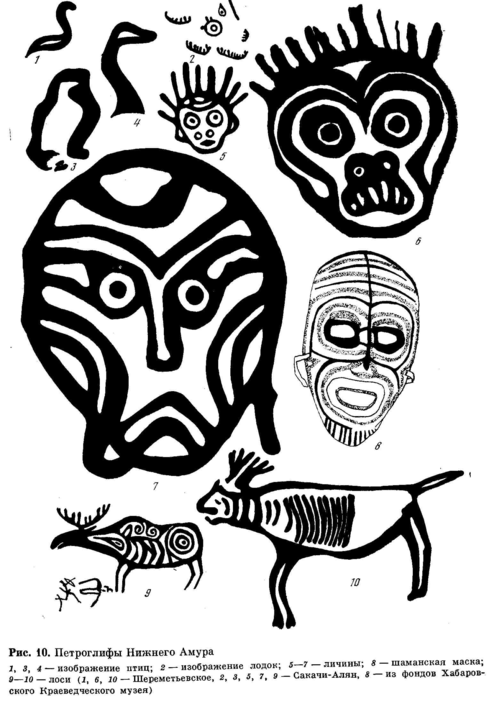 1,3,4 – изображение птиц, 2 – изображение лодок, 5-7 – личины, 8 – шаманская маска, 9-10 – лоси