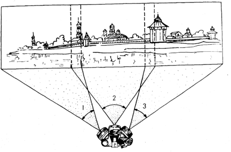 Круговая панорама (рис. 1) предполагает съемку объекта с одного места. Фотоаппарат последовательно поворачивается вокруг вертикальной (горизонтальная панорама) или горизонтальной (вертикальная панорама) оси. Она применяется в ситуациях, когда на снимке необходимо запечатлеть значительное пространство и этому не препятствуют находящиеся на местности сооружения, строения и т. п. объекты. Съемка производится с расстояния не менее 50 м.