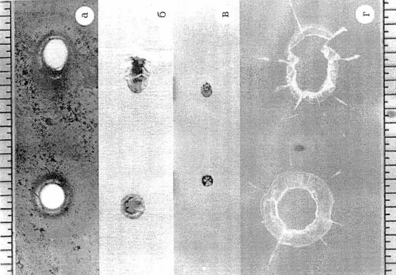 Пулевые пробоины при выстрелах из пистолета Макарова в различные преграды (слева — при выстреле перпендикулярно поверхности, справа — под углом, близким к 45 градусам): а — металл; б — фанера; в — листовая резина; г — оргстекло