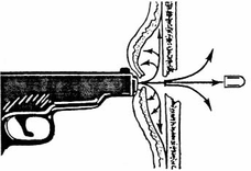К опоть, осевшая на пуле, легко счищается с ее поверхности при контакте даже с малопрочной преградой. В момент контакта часть копоти откладывается на преграде в так называемом пояске обтирания. Поясок обтирания — это кольцевое отложение по краям входного пулевого отверстия продуктов выстрела и материала поверхности пули. Другая часть копоти при этом образует два облака, одно из которых распространяется в направлении движения пули, а другое — в противоположном (рис. 8.1). Это приводит к тому, что на двухслойных преградах копоть, переносимая пулей, может откладываться также на втором слое и на обратной стороне первого слоя в виде зоны окопчения. Это явление впервые описал в 1962 году И.В.Виноградов, и оно вошло в теорию и практику криминалистики как «феномен Виноградова».