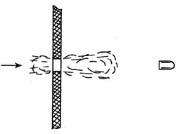 При стрельбе в эластичные преграды: например, резину, кожу и др. — пулевая пробоина значительно меньше диаметра пули, а диаметр пояска обтирания зависит от свойств конкретного материала, формы головной части пули и может быть как меньше, так и больше диаметра пули (рис. 8.3в).