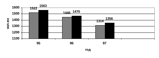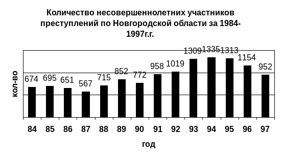 При общем снижении роста преступности несовершеннолетних на территории ОМ-1 УВД г. Новгорода зарегистрирован рост со 144 в 1996 до 237- в 1997году. Подобная ситуация зафиксирована и в Шимском ( с 15 до 30), Демянском ( с 27 до 47) и Окуловском ( с 44 до 49) районах.