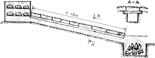 Устройство простейшей коптильни ясно из рисунка. Оптимальная длина наклонного дымохода должна быть не менее 7...10 метров. Если на участке есть погреб, можно использовать его, нет – придется устроить искусственную насыпь.