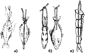 Варианты обвязки рыбы для горячего копчения: а – со вставной шпонкой, б – прошивка, в – обвязка. При холодном – рыбу просто подвешивают.