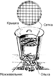 Этот способ имеет много преимуществ. Он быстрый, надежный, простой; рыба сразу готова к употреблению. И сооружений сложных не надо. Есть металлическая бочка – прекрасно, нет – можно обойтись старым ведром, только их надо тщательно прокалить. Обязательное условие – хорошо подогнанные крышки. Как использовать эти емкости – ясно из рисунка. Вставные сетки, на которые кладется рыба, делаются из отожженной стальной проволоки диаметром 4...6 миллиметров.