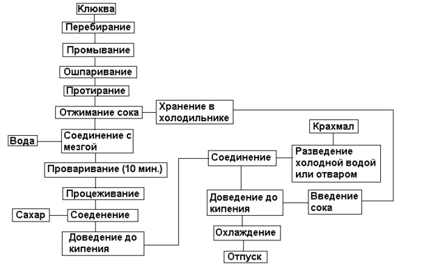 | Клюква | 126 | 120 | Клюкву или бруснику, или чернику или смородину, или вишню перебирают, удаляют плодоножки и моют, у вишни удаляют косточки. Плоды и ягоды протирают. Сок отжимают и процеживают. Мезгу заливают горячей водой (на 1 часть мезги 5 - 6 частей воды), проваривают при слабом кипении 10 - 15 мин и процеживают. В полученный отвар (часть его охлаждают и используют для разведения крахмала) добавляют сахар, доводят до кипения и при помешивании сразу вливают подготовленный крахмал. Вновь доводят до кипения и добавляют отжатый сок. Крахмал подготавливают следующим образом: Его разводят охлажденным отваром (на 1 часть крахмала 5 частей отвара) и процеживают. Алычу, или сливу, или мирабель (с удаленными косточками), или крыжовник варят с небольшим количеством воды в течение 7 - 10 мин, отвар сливают, ягоды или плоды протирают. В отвар добавляют сахар, пюре, доводят до кипения, вводят подготовленный крахмал и вновь доводят до кипения. Готовый кисель разливают в вазочки или стаканы с t 10 - 14С по 120 - 200 гр. |