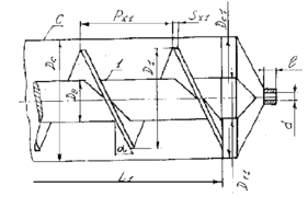 Шнек прессующего механизма имеет на своей поверхности винтовые канавки, разделенные лопастями. (рисунок 2). Для повышения технологичности шнек иногда выполняют составным из участков с разным шагом и высотой лопасти. Толщина лопасти шнека должна находиться в определенных пределах. Тонкие лопасти приводят к возрастанию утечек между шнеком и цилиндром, а толстые лопасти увеличивают потребляемую мощность привода. Возможен перегрев материала, попадающего в зазор между цилиндром и лопастью шнека. Уменьшение диаметра шнека позволяет с одной стороны облегчить заполнение прессующего механизма прессуемым материалом, а с другой стороны, как показывает практика, увеличить давление прессования.