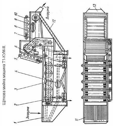В щітковій машині Т1-КУМ-III (мал1). Миття здійснюється у ванні 1 , звареної із листової сталі і прикріпленої до каркасу 12. Дно ванни має два заглиблення трапецеїдальної форми для збирання бруду і видалення його з машини.