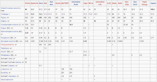 Виробники енергетичних напоїв запевняють, що їх продукція приносить тільки користь. Секрет успішності "енергетиків" не тільки в рекламі, а й у хімічному складі. Крім води, барвників і ароматизаторів, до них входить ціла низка компонентів, які самі по собі стимулюють фізичну й розумову діяльність: