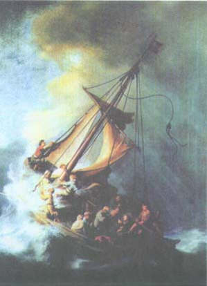 Обычно лодку бьют высокие волны. Ветер рвет паруса. В раннем христианском искусстве ветер может быть персонифицирован на античный манер: головы людей или животных дуют - щеки надуты, из ртов или пастей вырываются струи воздуха. Лодка в этом сюжете символизирует церковь, дающую спасение от волн и ветра, то есть от гонений, которым подвергались христиане, а сам сюжет, как трактуют его отцы церкви, - об испытании веры. "Ты переплываешь море этой жизни, -говорит Августин, - и ветер поднимается, застигают тебя бури и искушения. Отчего это, если не оттого, что Иисус засыпает в тебе? Если бы Он в тебе не спал, ты бы наслаждался внутреннею тишиною. Что же значит, что Иисус в тебе засыпает, если не то, что в сердце твоем вера Иисусова дремлет? Что же ты должен сделать для своего избавления? Пробуди Его и скажи: "Наставник! мы погибаем!" Он пробудится, то есть к тебе возвратится вера и пребудет в тебе. Когда пробуждается Христос, тогда и среди бурных треволнений вода не зальет твоего корабля, твоя вера будет повелевать ветрами и волнами и опасность минует".