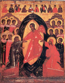 Икона "Сошествие во Ад" рубежа XIV-XV веков захватывает своим драматическим накалом, выраженным прежде всего в плотности и контрастности резко ограниченных цветовых пятен - красных, темно-зеленых и темно-коричневых. Христос одет в нехарактерные для русской иконописи ярко-красные одежды, на которых сверкают белые блики. В верхней части иконы изображен деисус.