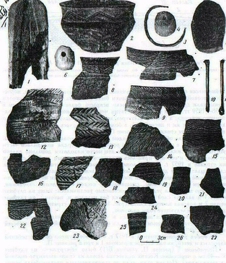 Рис. 2. Фрагменты сосудов и орудия труда