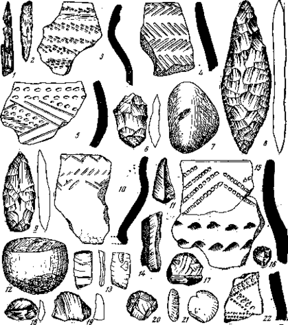 1, 2 – костяные проколки и обломок наконечника стрелы; 3–5 –керамика; 6-9, 14,18, 19-каменные и кремневые орудия со стоянки Ахметово I; 10,15, 22-керамика; 12-отбойник; 21-глиняный штамп со стоянки Ахметово II; 11, 13, 16, 17, 20-кремневые орудия со стоянки им. М.И. Касьянова (2/3 н.в.)