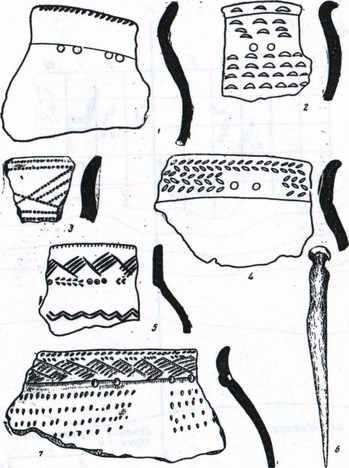 1, 2, 4, 5, 7 – керамика; 6-костяная проколка со стоянки им. М.И. Касьянова; 3-керамика со стоянки Ахметово II (около 2/3 н.в.)