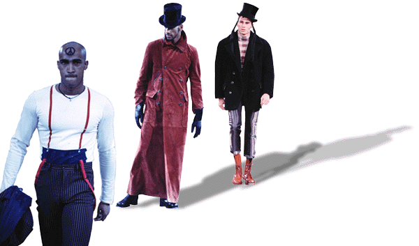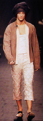 оединение мужского и женского начала, имеющее место в данной коллекции, в высоко моде первым поставил своей целью Готье. Он сломал и перевернул все традиции мужской одежды, безо всякой задней мысли облачив здоровенных мачо в юбку-брюки, свитера-декольте и топы. Готье выдвигает идею мужчины – сексуальной игрушки, его модели играют роль сатиров общества и высмеивают консервативность мужского тщеславия и поведения. В то время как Готье уже 14 лет с задором бойскаута ведет войну на подрыв имиджа мачо, в индустрии м