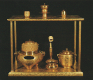 Так сочетание цвета металлических сосудов для кипячения воды, керамической чаши и вазы белого или зеленовато-желтого цвета, узаконивает главный окрас в японском костюме: золото, охра, бежевый, белый, зелень.