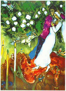 В любом произведении Шагала мы найдем эту свободу фантазии. Но каждый раз фантастическое предстает перед нами как совершенно реальное. В картине «Над городом» художник и его жена Белла летят над Витебском. Они делают это так же естественно, как если бы шли по улице или сидели на скамейке. Он придерживает ее тело, словно оберегая его от неверного поворота или неаккуратного движения. Она с грустью смотрит вдаль и машет рукой -- то ли прощаясь с кем-то, то ли кого-то приветствуя (или козочку, щиплющую траву на задворках, или случайного прохожего, справляющего нужду у высокого забора). Их души доверены друг другу и открыты, как ни в одном реалистическом портрете XIX века, славившегося своим психологизмом.