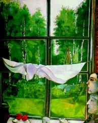 олько у Шагала люди умеют так летать. Только у него умеют так внимательно и жадно смотреть, как смотрят те же персонажи, вплотную приблизив свои головы к оконному стеклу, в картине «Окно на даче. Затишье»-- на зелень травы, на расцветший сад, на вытянутые кверху стволы берез. Простая бытовая сцена приобретает сновидческий характер. Сон всегда у Шагала перемешан с явью -- даже тогда, когда на его картинах изображены самые простые и обыденные явления жизни.